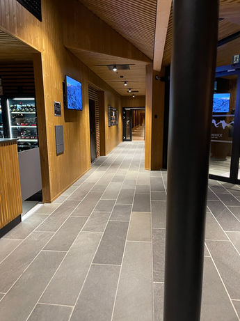 Innvendig er det benyttet Altaskifer flis med naturoverflate i fellesarealer og kommunikasjonssoner, der slitestyrke og enkelt vedlikehold er avgjørende.