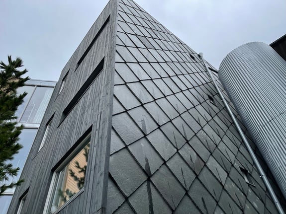Tradisjonell – takskifer på vegg monteres som på tak. Utvalget og mulighetene er de samme som for takskifer.